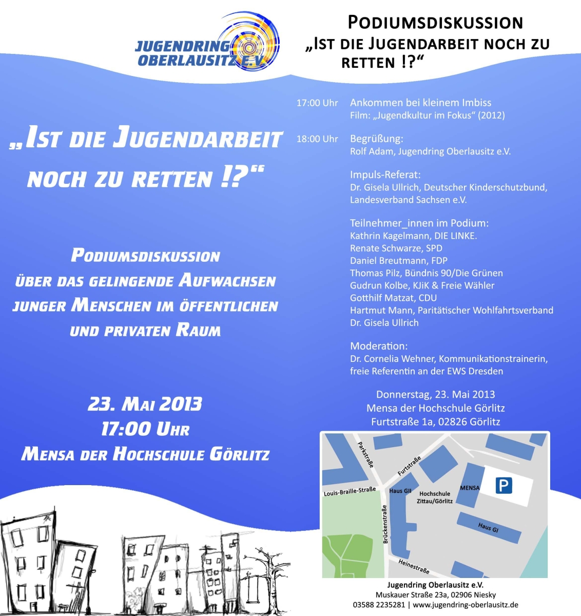Im Mai 2013 organisierte der Jugendring Oberlausitz e.V. zusammen mit dem Flexiblen Jugendmanagement eine Podiumsdiskussion zum Thema „Ist die Jugendarbeit noch zu retten!?“ in der Mensa Görlitz an der Hochschule Zittau/Görlitz. Eingeladen waren Vertreter_innen aller Kreistagsfraktionen aus dem Landkreis Görlitz sowie Dr. Giesela Ullrich (Deutscher Kinderschutzbund, Landesverband Sachsen e.V.) und Hartmut Mann (Paritätischer Wohlfahrtsverband Sachsen). Moderiert wurde die Podiumsdiskussion durch Dr. Cornelia Wehner, Kommunikationstrainerin, freie Referentin an der EWS Dresden.