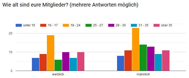Der Fragebogen wurde sowohl digital als auch analog verwendet. Über vorhandene Kontaktdaten und Adressen wurden auf die Befragung hingewiesen und der Fragebogen verteilt. Außerdem fanden mehrere Landkreistouren direkt zu den Jugendclubs und -vereinen statt, um direkt vor Ort Mitglieder anzutreffen und mit diesen den Fragebogen auszufüllen. Von den uns derzeit bekannten 71 Jugendclubs, -vereinen und Kulturvereinen nahmen 26 an der Befragung teil. Es ist unser Ziel, die Befragung im Jahr 2019 fortzuführen, um noch mehr Ergebnisse zu erhalten. Folgende Zwischenergebnisse geben einen Überblick zu den bisherigen Rückmeldungen: