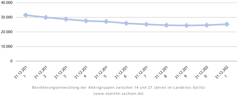 Der Landkreis Görlitz hat 248.273 Einwohner*innen (Stand 01.01.2022), davon 25.259 im Alter zwischen 14 und 27 Jahren (10,2 %). In den vergangenen elf Jahren hat der Landkreis insgesamt 19.542 Einwohner*innen verloren, darunter 6.266 im Alter zwischen 14 und 27 Jahren (www.statistik.sachsen.de).