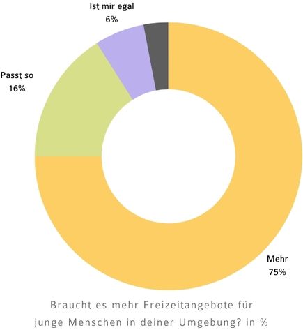 Im Anschluss wurde gefragt, ob es mehr Freizeitangebote für Jugendliche in deren Umgebung braucht. Dem stimmten drei Viertel der befragten Jugendlichen zu und nur 16 % gaben an, dass das aktuelle Freizeitangebot für sie passend ist. Auch der Großteil derjenigen Jugendlichen, die sich keinen Jugendclub wünschen oder angeben, dass ihnen dieser egal sei, geben hier an, dass sie sich mehr Freizeitangebote wünschen.