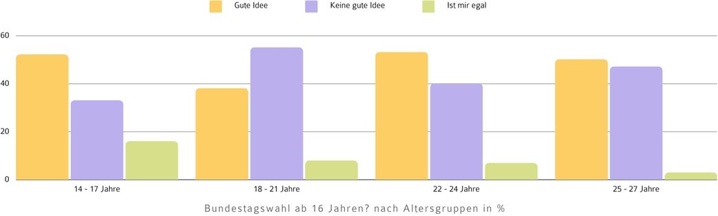 Anschließend wurden die Teilnehmer*innen dazu befragt, ob es aus ihrer Sicht eine gute Idee wäre, bei Bundestagswahlen schon ab 16 anstatt ab 18 Jahren wählen zu können. Hier zeigt sich ein recht ausgewogenes Bild. 46 % finden, dies sei eine gute Idee, während 44 % diese Idee nicht gut finden und 10 % angeben, dies sei ihnen egal. Diese Einschätzung variiert auch nicht besonders, unterscheidet man hierbei nach Teilnhemer*innen, die sich politisch interessiert bzw. kaum interessiert oder männlich, weiblich bzw. divers einordnen. Lediglich bei der Betrachtung der Altersgruppen lassen sich Unterschiede bei der Beantwortung dieser Frage gerade zwischen den 14- bis 17-Jährigen (52 % gute Idee, 33 % keine gute Idee) und 18- bis 21-Jährigen (38 % gute Idee, 55 % keine gute Idee) erkennen.