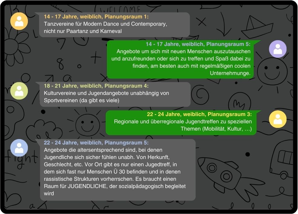 Auch im Bereich der Mobilität gab es in der Befragung die Möglichkeit, eigene Gedanken oder Vorschläge in einem Freitextfeld zu äußern. Etwa die Hälfte der Befragten hat diese Chance genutzt und dabei kristallisierten sich folgende Punkte heraus: Am häufigsten wünschen sich die jungen Menschen eine bessere Taktung und regelmäßigere Fahrzeiten der öffentlichen Verkehrsmittel. Auch die Fahrpreise, eine bessere Anbindung von Orten sowie die Wochenendfahrzeiten wurden hier oft genannt. Darüber hinaus gab es vielseitige Vorschläge zur Verbesserung der Situation, wie zum Beispiel eine genauere Anpassung der Fahrzeuggröße an die Anzahl der Nutzer*innen. Lassen wir die folgenden Originalzitate für sich sprechen: