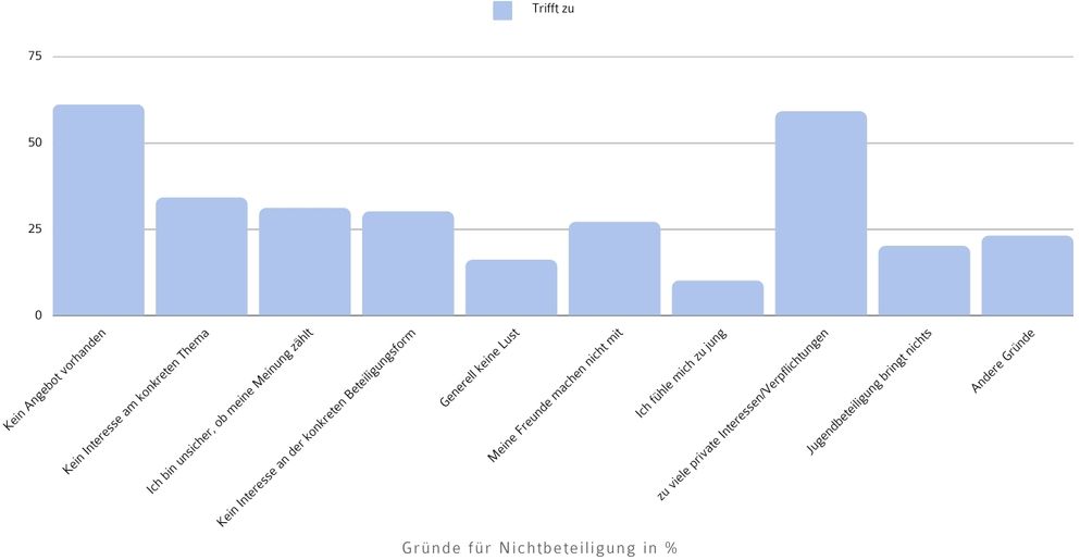 Als wichtigste Gründe für Nichtbeteiligung wurden in allen Altersgruppen fehlende Angebote (61 %) und zu viele private Interessen/Verpflichtungen (59 %) genannt.