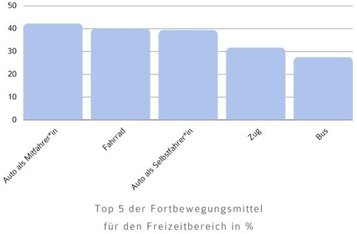 Im nächsten Schritt wurden die Fortbewegungsmittel abgefragt, die in der Freizeit der Teilnehmenden genutzt werden. Im Vergleich zum Schul- und Arbeitsweg werden hier das Auto als Mitfahrer*in (42,1 %) und das Fahrrad (39,9 %) häufiger angegeben und auch der Zug (31,5 %) spielt eine wichtigere Rolle. Das Auto als Selbstfahrer*in (39,2 %) und der Bus (27,3 %) finden sich ebenfalls in dieser Top 5 wieder.