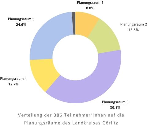Die Jugendbefragung 2022 konnte land-kreisweit 386 Teilnehmer*innen im Alter von 14 bis 27 Jahren erreichen. Die Aufteilung auf die Planungsräume gestaltet sich dabei wie folgt: