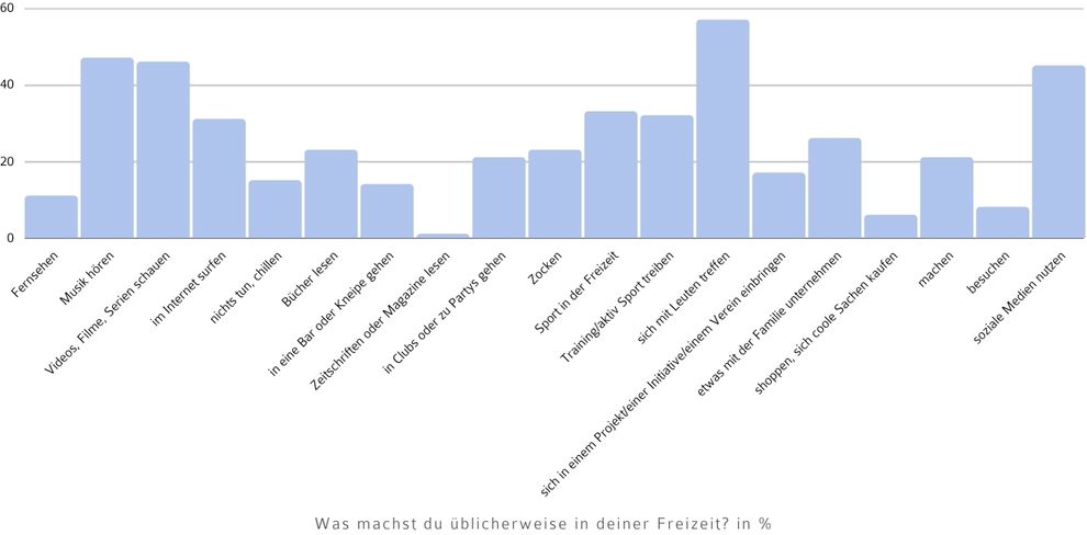 Bei den Top 5 der Freizeitaktivitäten ergibt sich ein Bild, das in einigen Ausschnitten den Ergebnissen der 18. Shell-Jugendstudie ähnelt oder Entwicklungen aus den vergangenen Befragungen fortschreibt. So sind die häufigsten Freizeitbeschäftigungen der Befragten: sich mit Leuten treffen (57 %), Musik hören (47 %), Filme, Videos und Serien anschauen (46 %), soziale Medien nutzen (45 %) und Sport treiben (33 %). Zudem zeichnet sich der Rückgang des Fernsehkonsums deutlich ab (Shell-Jugendstudien: 2002: 59 %; 2006: 58 %; 2010: 53 %, 2015: 49 %; 2019: 33 %) (18. Shell-Jugendstudie 2019, 214). Gleichzeitig ist der Konsum von Videos, Filmen und Serien gestiegen (2015: 15 %; 2019: 45 %).